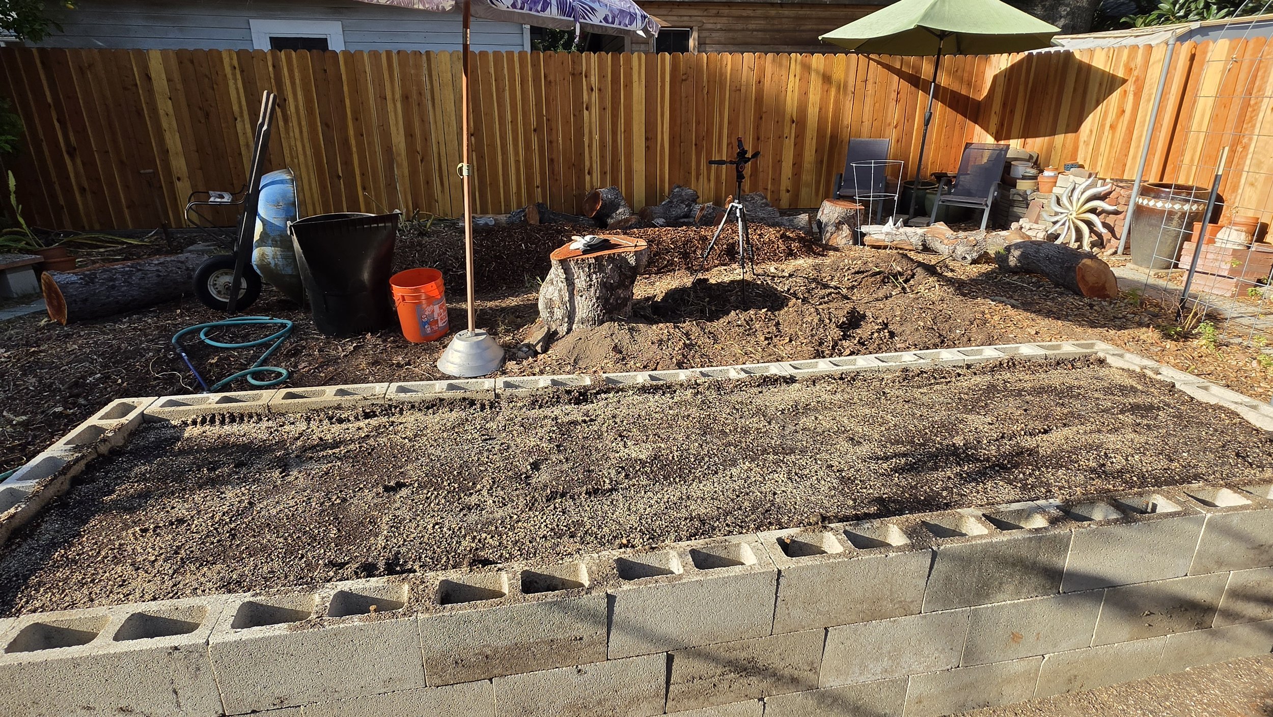 Saturday morning, I picked up a full cubic yard of veggie mix from O.F. Wolfinbarger Inc. in Chino. Hauled it home, and spent the afternoon filling the bed on top of the hügelkultur base. But before the soil went in, I added an entire bag of worm castings and a generous amount of used coffee grounds across the top of the hügelkultur material — one more layer of biology to kickstart decomposition and feed the microorganisms that will make this bed come alive.