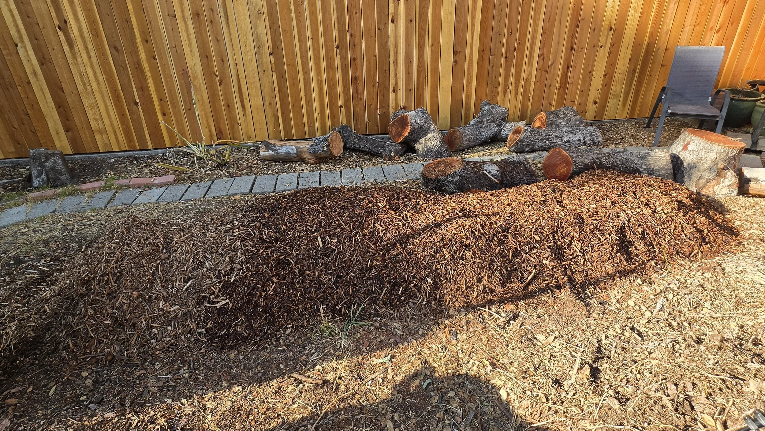Here's the mother pile, tucked along the fence line with the old avocado logs behind it. The plan is to let the mycelium colonize this pile over the coming weeks, and then spread the inoculated chips into the raised bed and the orchard area. Essentially, this pile is a nursery for the fungal network that will eventually run through the whole garden.