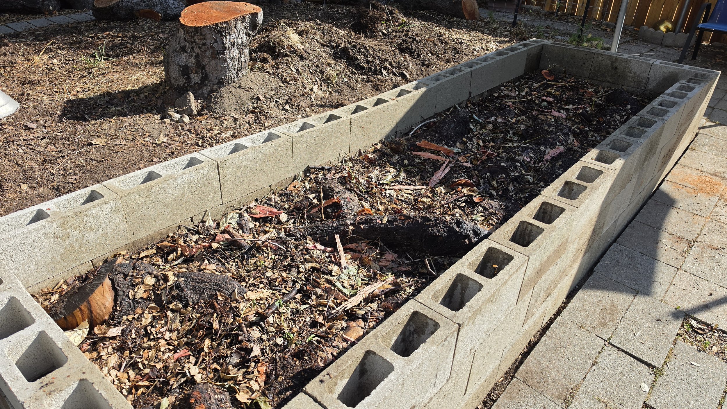 Here's what the bed looked like a few days ago, before I added the soil. You can see the layers of wood, branches, and organic debris packed into the cinder block frame. This is the foundation — the "skeleton" of the bed that will decompose slowly over the next several years, feeding the soil from below.