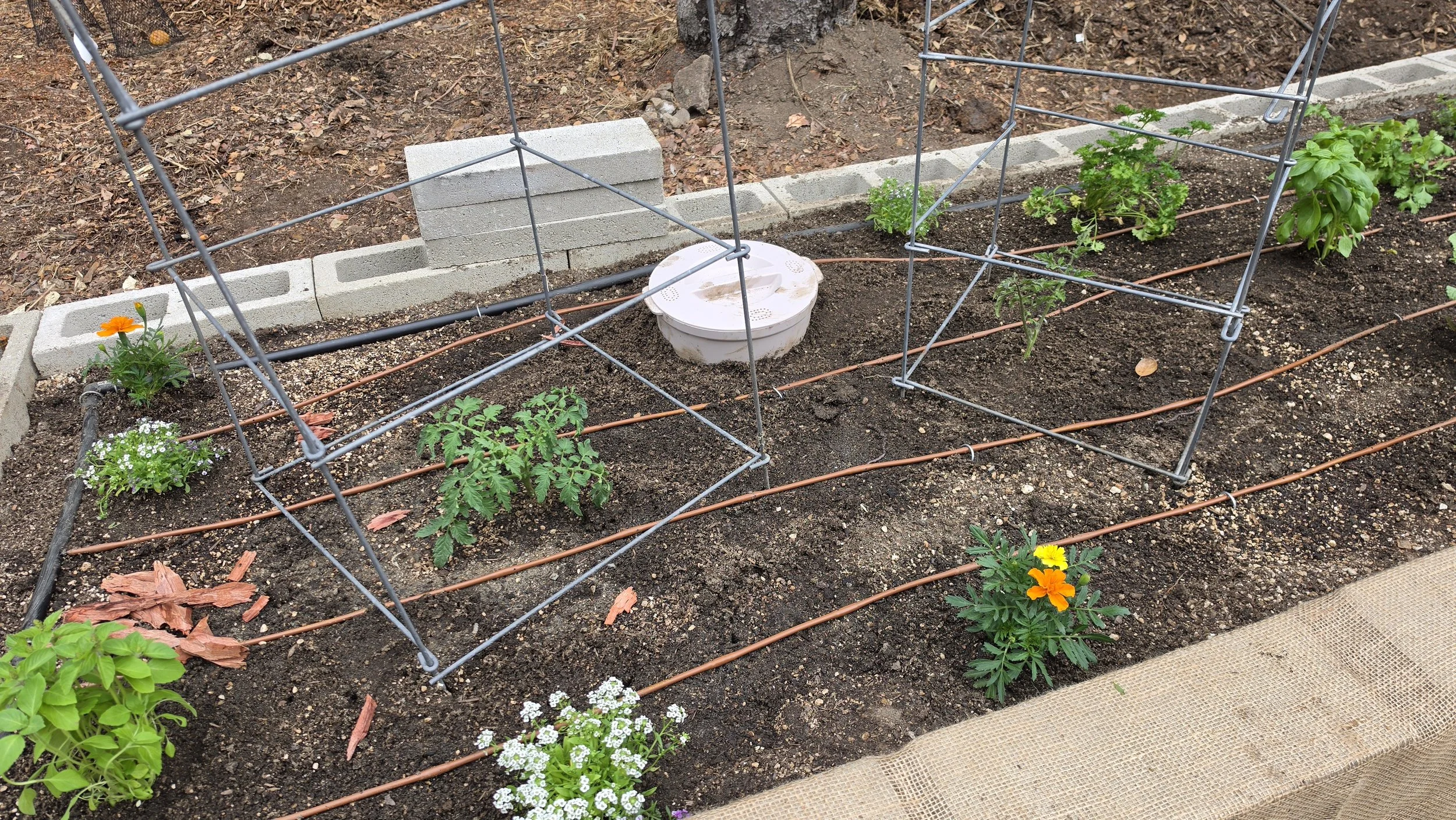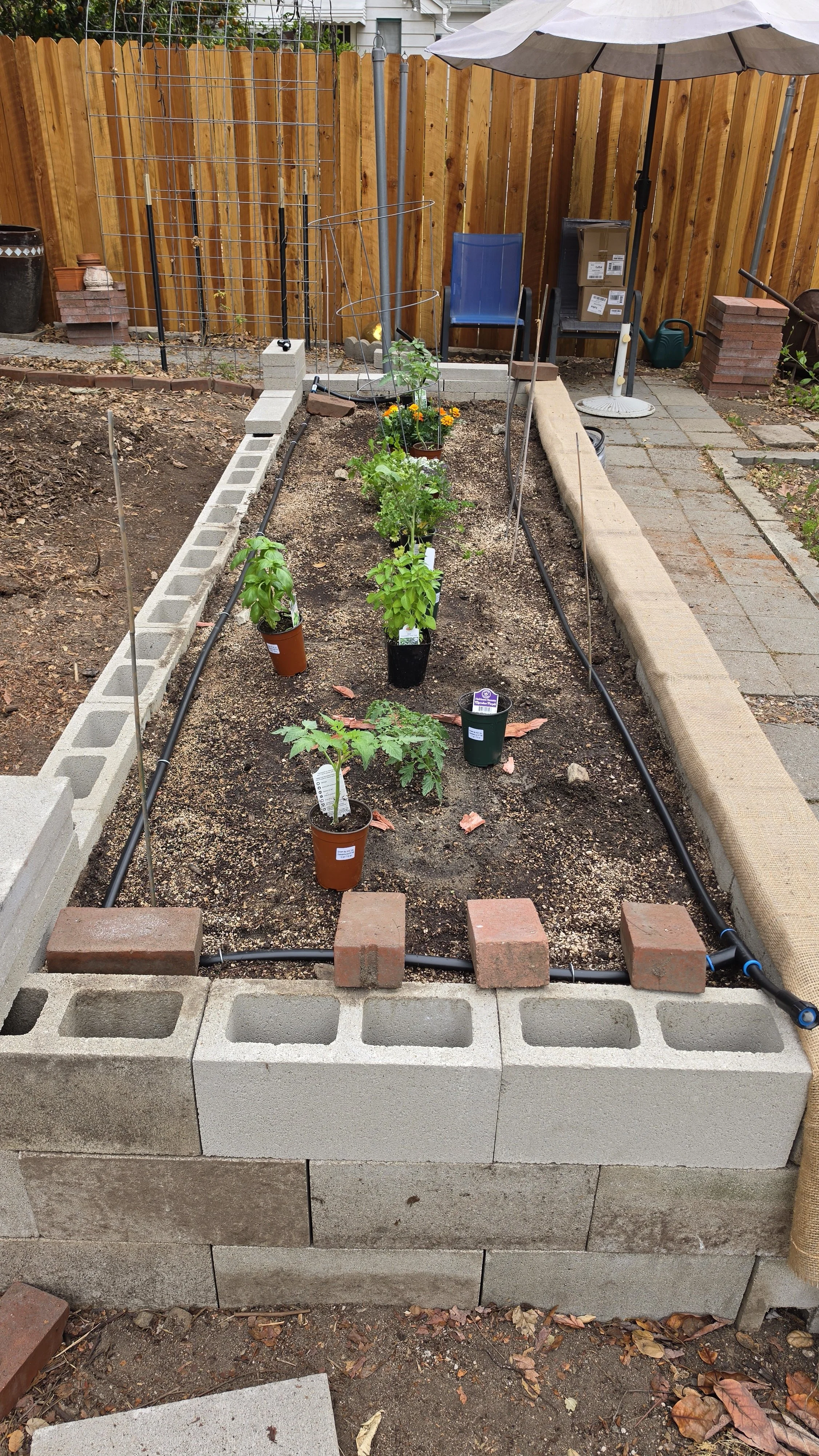 This is where we left off at the end of the Monday livestream. The bed was built, the outer irrigation was roughed in, and the plants were sitting in their pots ready to go. I came back the next morning to finish everything up.