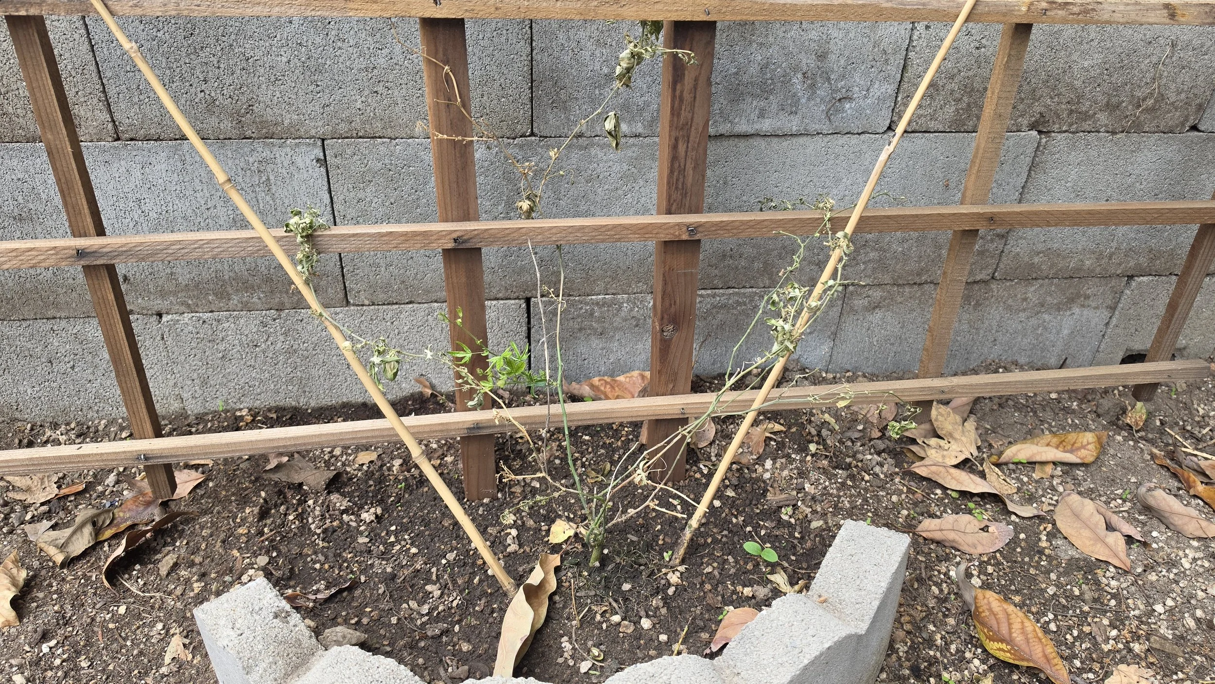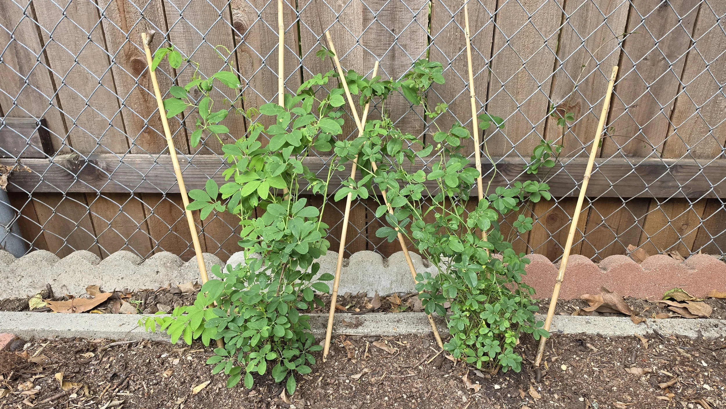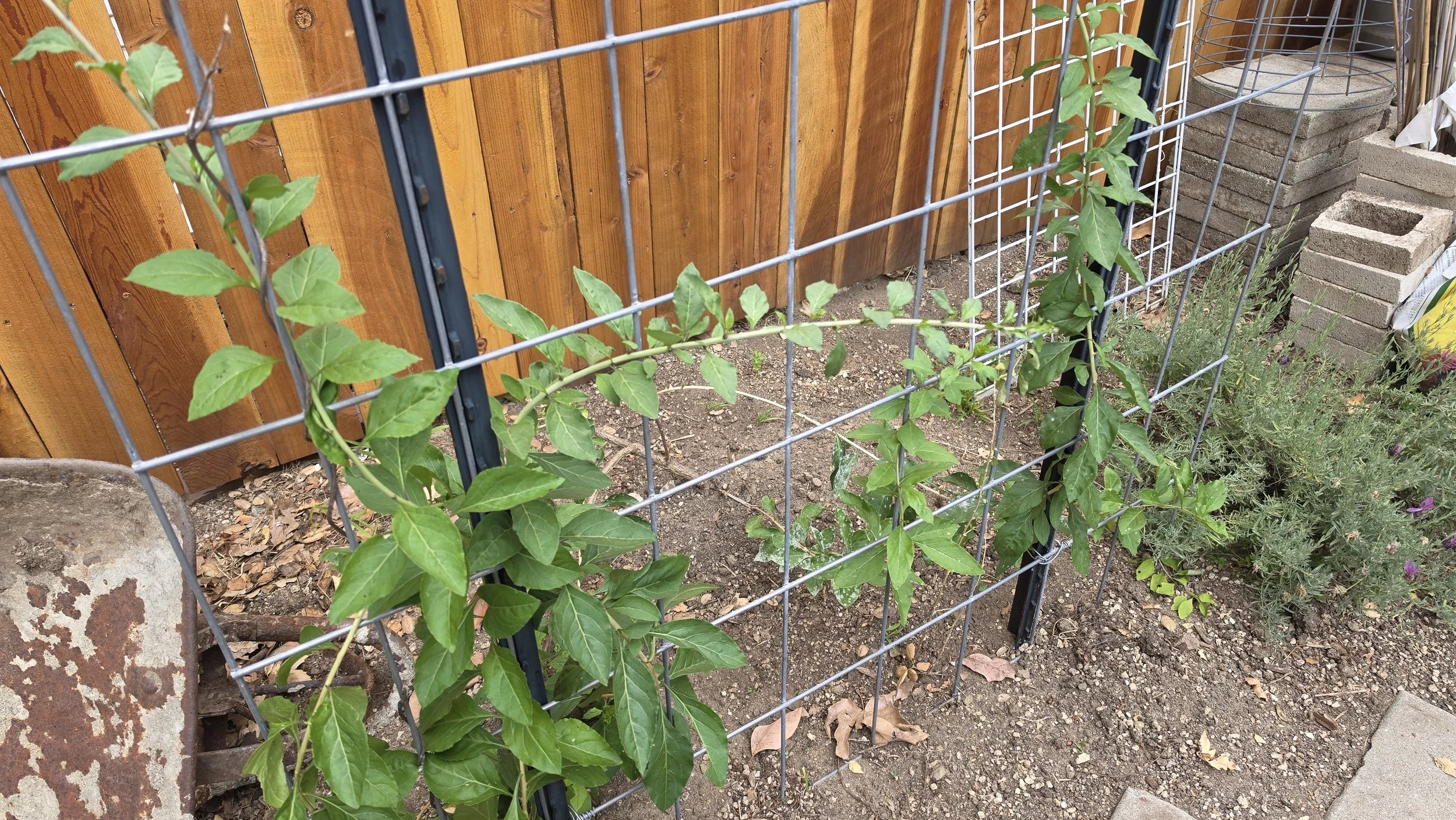 The plant still needs an arbor — we have fence posts on either side and a plan to run wire between them to create a simple training structure. That's coming soon; I just haven't gotten to it yet.