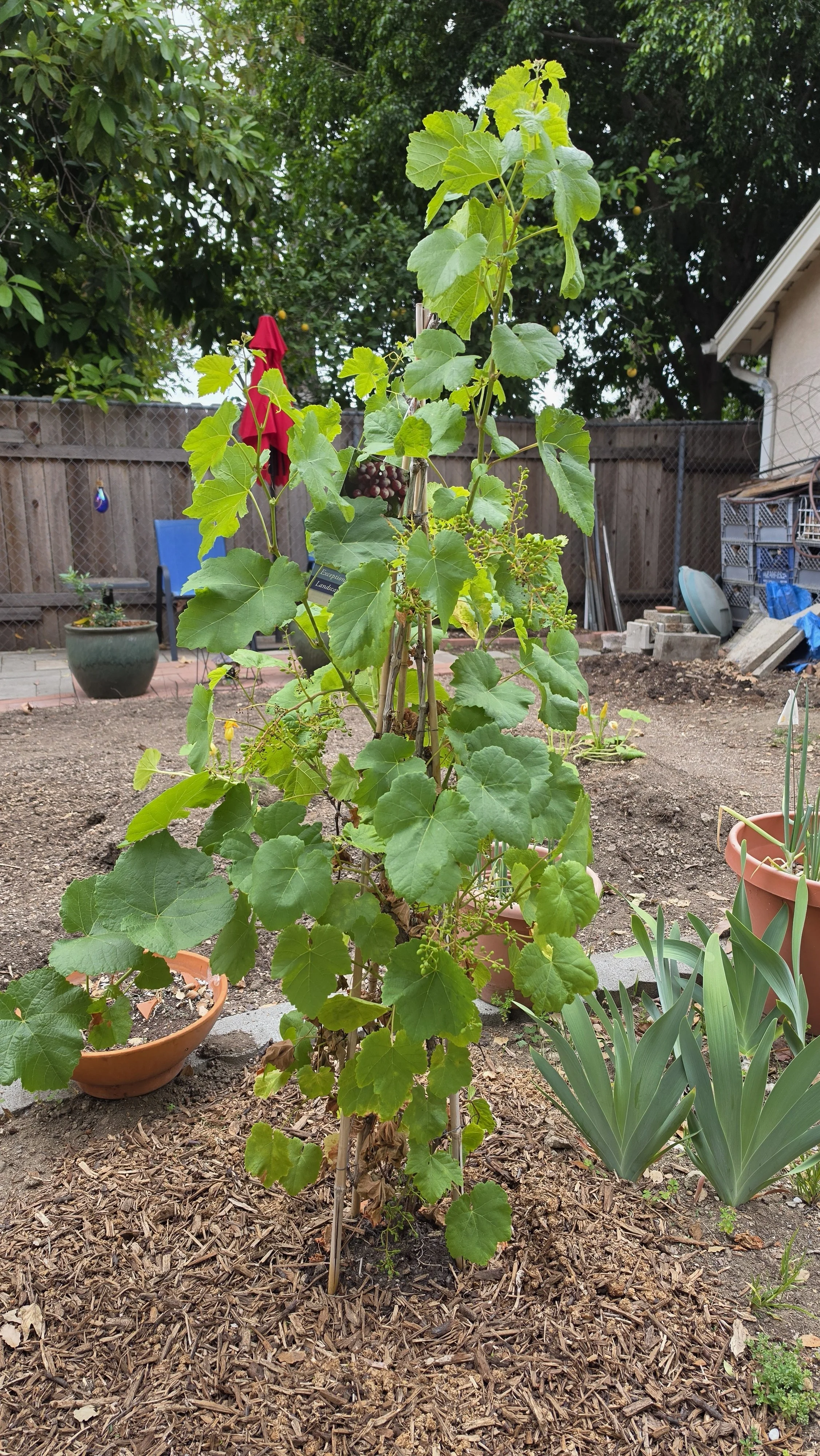 You'll notice in the photo that it's already forming small grape clusters. The technically correct thing to do at this stage would be to remove them so the plant can direct its energy toward establishing roots rather than producing fruit. I am not doing that. My dad wants to taste them, so we're leaving them on.