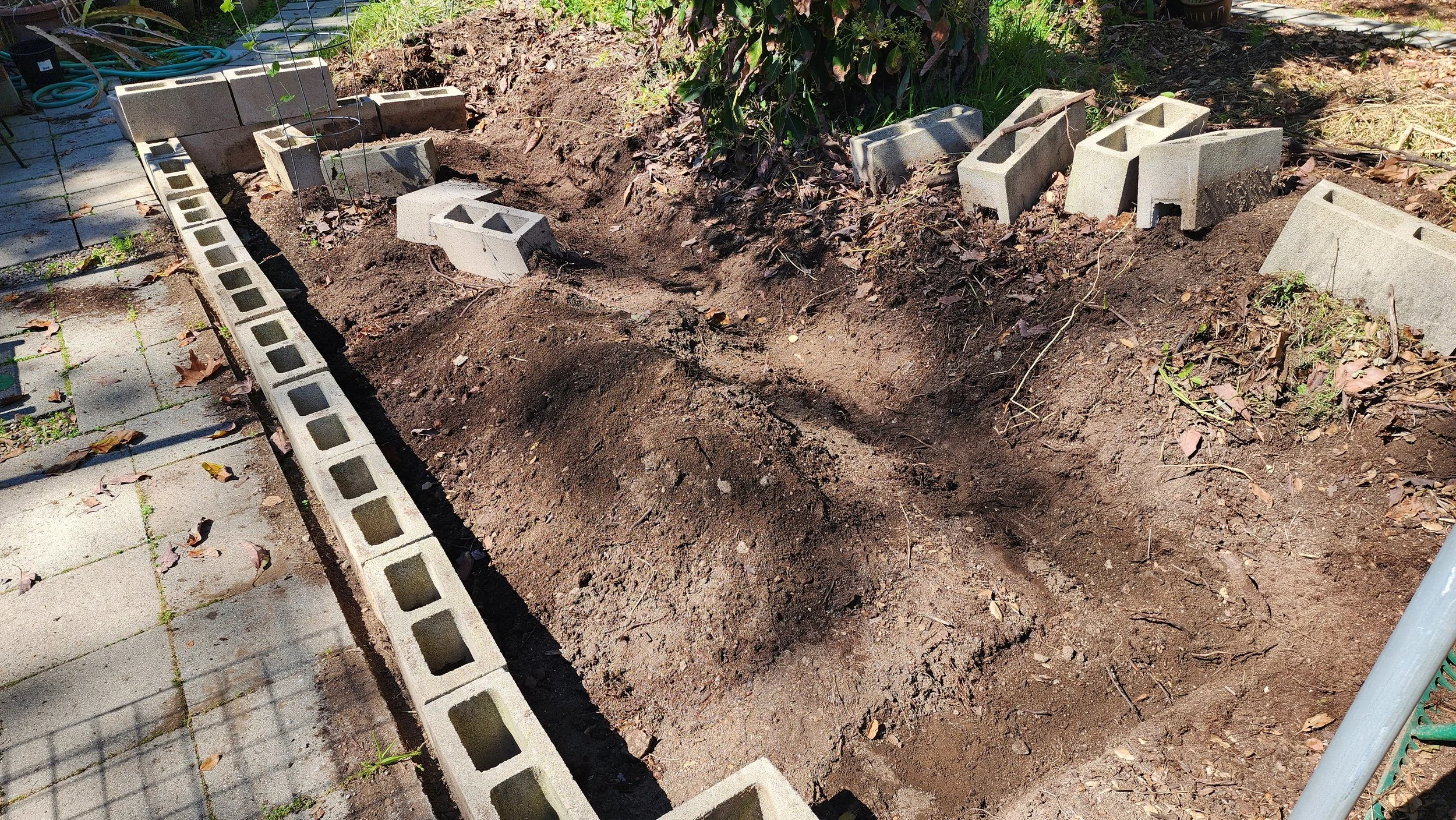 I raked back the avocado leaves, flattened the ground a bit, and laid out the blocks to get a general sense of placement.